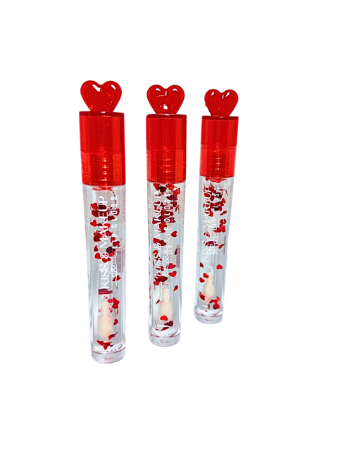 Fall in love with glossy perfection with our Kiss & Makeup Clear Lip Gloss, designed to give your lips a stunning shine with an extra touch of romance! Housed in a sleek tube, this ultra-glossy formula features adorable red heart-shaped accents suspended in the gloss and a charming red heart on top of the wand, making every application feel special.
